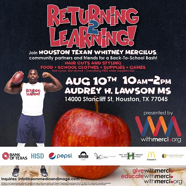 Houston Texans Whitney Mercilus is returning to the field this season showing NO MERCI, and off the field he is assisting Houston Independent School District students as they are RETURNING 2 LEARNING. Mercilus is working through his foundation, The WithMerci Foundation, to provide underserved children with FREE haircuts, hair styles, schools supplies and vouchers for school clothes.