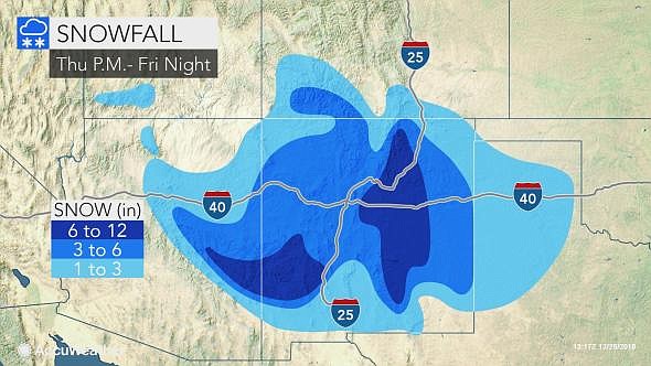 Enough snow for shovels and plows to be needed is forecast for places such as Winslow, Arizona, and Gallup, Albuquerque, Santa Fe, Tucumcari, Truth or Consequences and Roswell, New Mexico.