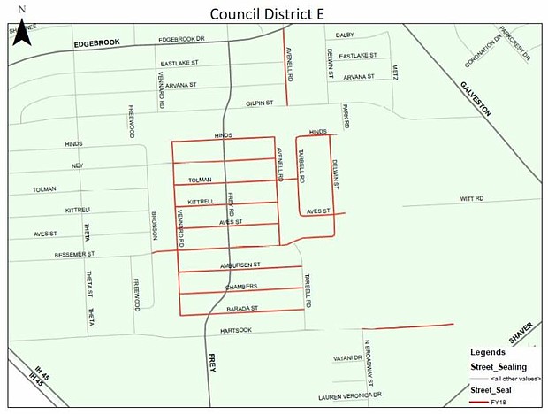 Houston City Council Member Dave Martin would like to announce that street sealing is scheduled to occur in the Freeway Manor area tomorrow, Wednesday, March 21. The duration of work is expected to be complete by Monday, March 26, weather permitting. For a map of the impacted streets, please see the image below.