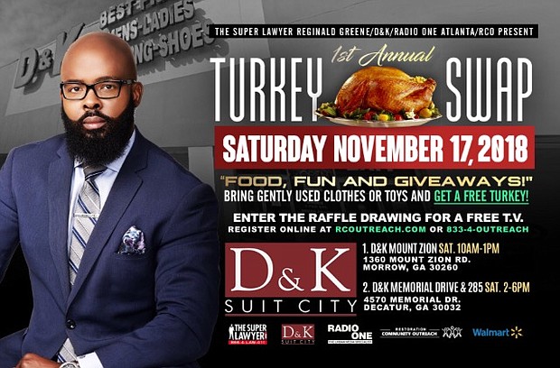 The Super Lawyer (Reginald Greene), Radio One, D & K Suit City team up to support Restoration Community Outreach with this year’s Turkey Swap