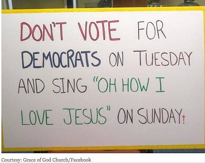 The Grace of God Church in New Port Richey may no longer be a polling location after the pastor put a sign in the yard that read, "DON'T VOTE FOR DEMOCRATS ON TUESDAY AND SING 'OH HOW I LOVE JESUS' ON SUNDAY!'"