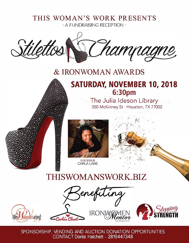 On November 10, 2018, This Woman’s Work, a non-profit 501(c)(3), will hold its annual Stilettos & Champagne Fundraising Reception Saturday, Nov. 10 at the Julia Ideson Library, located at 550 McKinney St, Houston, from 6:30 – 10 p.m.