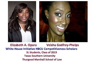 Third-year, Thurgood Marshall School of Law students, Elizabeth A. Opara and Veisha Godfrey-Phelps have been named 2018 HBCU Competitiveness Scholars by The White House Initiative on Historically Black Colleges and Universities (WHIHBCU)—a student recognition program which honors outstanding students for their academic merit, campus leadership, civic engagement and entrepreneurial spirit and empowers them to be advocates for excellence and competitiveness. As HBCU Competitiveness Scholars, both Opara and Godfrey-Phelps will attend the 2018 National HBCU Week Conference on September 16-19, 2018 in Washington, D.C. and be publicly acknowledged during the recognition ceremony on Monday, September 17. Both students will also receive an acknowledgment certificate signed by the Mr. Johnathan Holifield, WHIHBCU executive director.