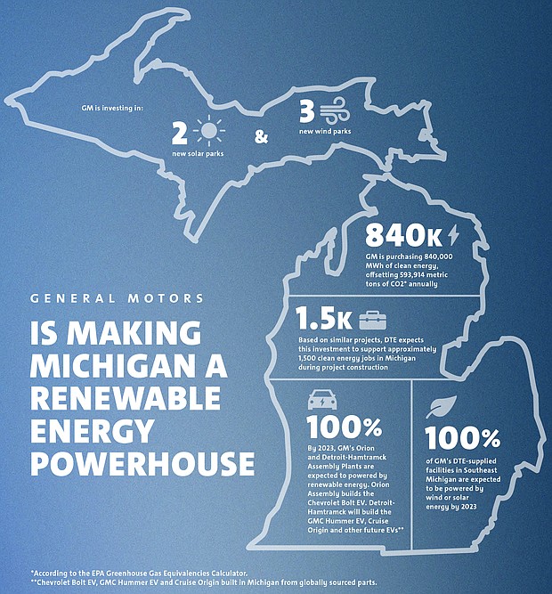 General Motors and DTE Energy are working together to accelerate Michigan’s transition to renewable energy with a deal to source 500,000 megawatt hours of solar energy as part of DTE’s MIGreenPower program. This follows an initial investment of 300,000 MWh of wind energy purchased by GM in February 2019, bringing the total amount to more than 800,000 MWh, or the amount of electricity consumed by more than 100,000 homes in an average year.*