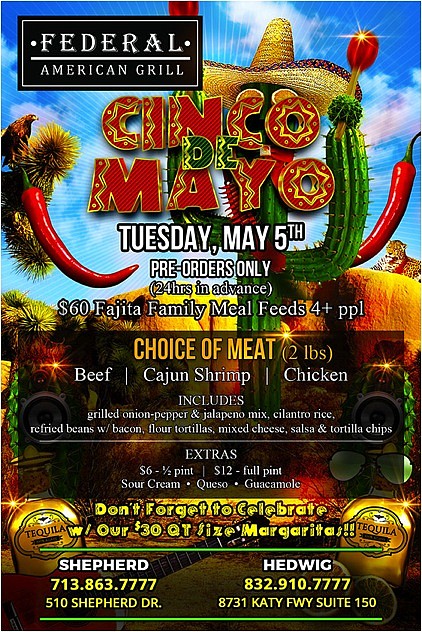 The typical Cinco de Mayo is a day of eating tacos and drinking margaritas. The Federal American Grill’s Matt Brice is planning to celebrate Cinco de Mayo with Fajita and Margarita menu to go on Tuesday, May 5th. The typical Cinco de Mayo is a day of eating tacos and drinking margaritas. The Federal American Grill’s Matt Brice is planning to celebrate Cinco de Mayo with Fajita and Margarita menu to go on Tuesday, May 5th.
