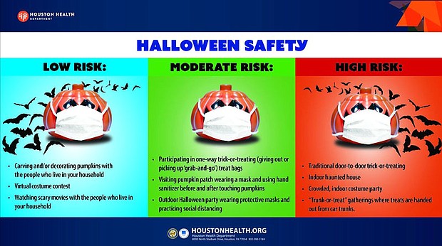 The Houston Health Department encourages people to forgo traditional trick-or-treating and Halloween gatherings this year in favor of safer alternatives. Going door-to-door and attending traditional Halloween events are high-risk activities for spreading COVID-19 during the pandemic.
