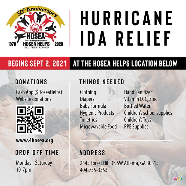 Hosea Helps, Inc. announces its hurricane relief donation drive to provide food and supplies to those impacted by Hurricane Ida. Beginning on Thursday, Sept. 2 and running thru Friday, Sept. 10, 2021, Hosea Helps will be accepting donation of food and supplies at it headquarters located at 2545 Forrest Hills Drive SW Atlanta, GA 30315 between the hours of 10:00 a.m and 7:00 p.m. Hosea Helps will deliver hurricane relief supplies to New Orleans, Louisiana.