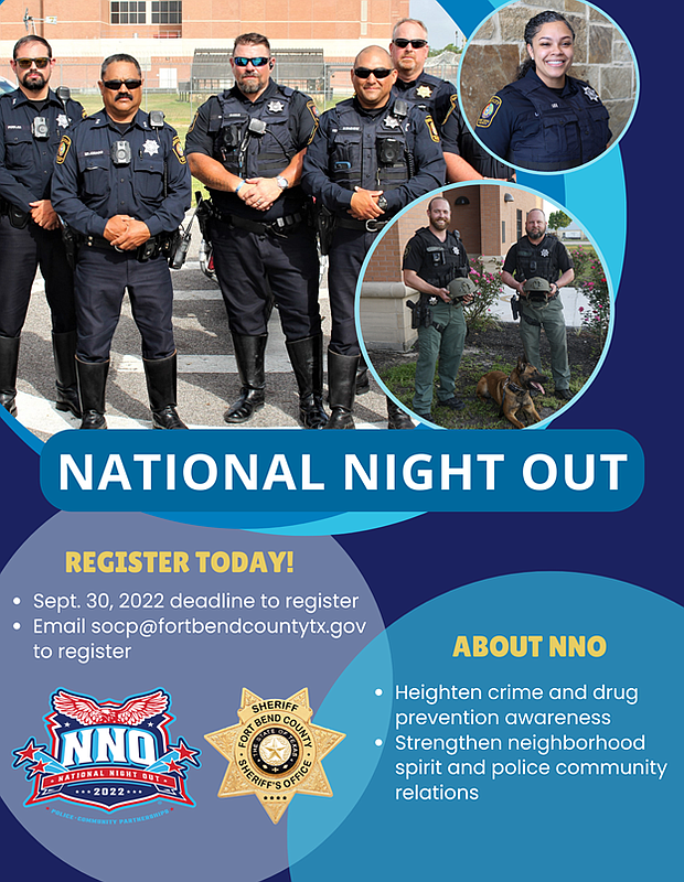 Citizens, along with business and community leaders of unincorporated areas of Fort Bend County, are invited to join their neighbors and meet with Fort Bend County Sheriff’s deputies during the 38th Annual Texas National Night Out, the nation's night out against crime. This year, Fort Bend County citizens will celebrate National Night Out on Tuesday, Oct. 4, 2022, by joining their neighbors at neighborhood block parties all across the county. Registration is required and is now open for groups wishing to have a Sheriff’s Office representative attend their gathering.
