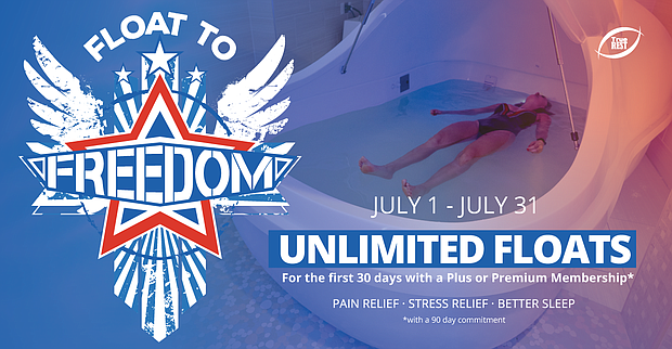 In celebration of July and recognition of the United States’ independence, True REST Float Spa is offering a unique flotation therapy opportunity for its guests—new and current members can Float to Freedom with 30 days of unlimited float therapy. The unlimited float therapy is available for first time members or for current members who upgrade their floating membership plan to plus or premium. Members have the freedom to experience all the incredible benefits flotation therapy has to offer now until July 31.