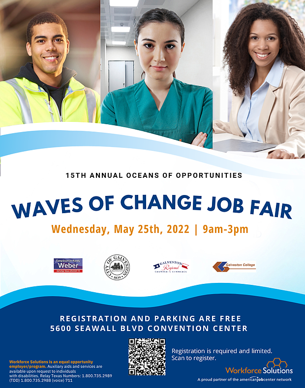 Catch the Wave of Change at this year’s 15th Annual Oceans of Opportunities Job Fair on Wednesday, May 25th from 9 a.m. to 3 p.m. at the Galveston Island Convention Center at the Saint Luis Resort.