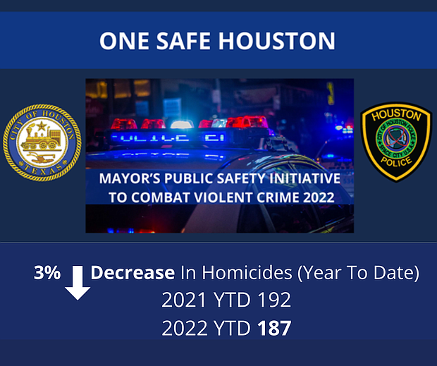 Mayor Sylvester Turner and the Houston Police Department announced today that for the first time in more than a year, Houston’s homicide rate is showing a decline. As of today, there is an unofficial number of 187 homicides in Houston thus far in 2022 compared to 192 homicides at this time last year.