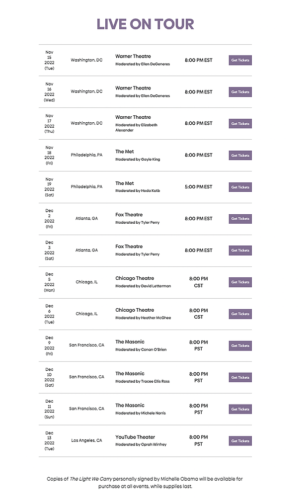 Michelle Obama Announces All-Star Lineup of Moderators and Additional Dates for The Light We Carry Tour