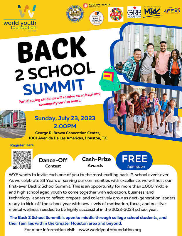 World Youth Foundation is hosting a free Back 2 School Summit Saturday, July 23, 2023 at The George R. Brown Convention Center. The event will kick off at 2:00 PM and will consist of youth performances, guest speakers, workshops, information on health and wellness, fun, entertainment and more.