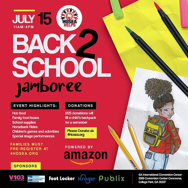 Hosea Helps, Inc., continuing the legacy of the late Hosea Williams Sr., plans to celebrate the ending of a safe and fun summer with a grand sized education focused festival. Hosting their 17th Annual Back 2 School Jamboree on Saturday, July 15th, 2023, Hosea Helps returns to the Georgia International Convention Center 2000 Convention Center Concourse, College Park, GA 30337 from 11:00 am - 4:00 pm, and to their roots with services and activities for the children alongside its drive-through giveaway for Georgia’s families.