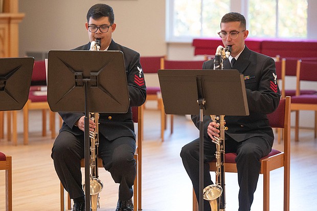 Musician 1st Class Christopher Rueda, from Mason, Ohio, and Musician 1st Class Chanse Morris, from Houston, Texas, perform with the U.S. Navy Band clarinet section