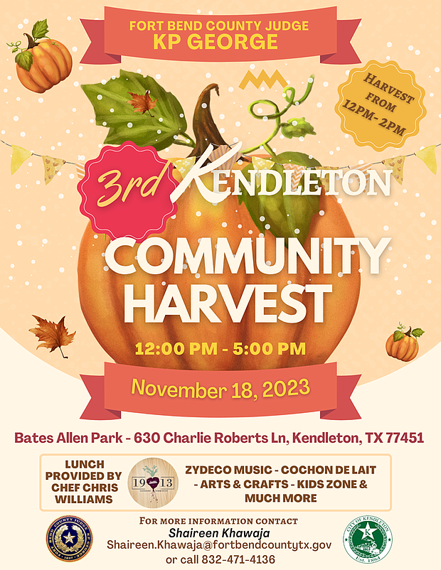 Fort Bend County Judge KP George, in collaboration with Lucille’s 1913 and the city of Kendleton, is set to host the third Annual Community Harvest on Saturday, November 18, 2023.