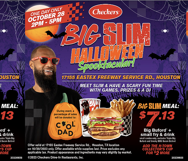 It’s a Spooky Celebration with Slim Thug! Checkers is celebrating Halloween with long-time friend, Slim Thug, on October 28th by hosting a “Spooktacular” party, bringing back a limited-edition special meal and benefiting a community organization. Kids are encouraged to wear their Halloween costumes and take pictures with Slim Thug.