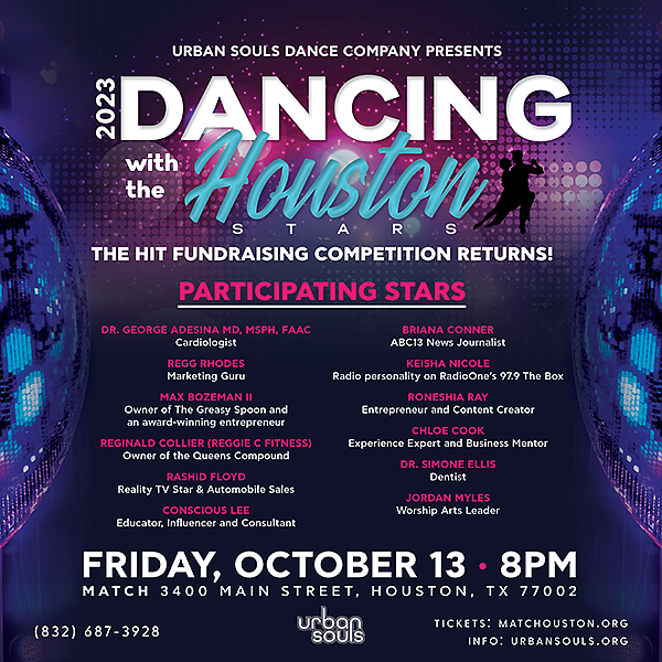 The 2023 Dancing with the Houston Stars event will showcase 12 Houston influencers, achievers, and leaders ready to trade in their “day jobs” for a fun evening of toe-tapping and eye-brow-raising performances in front of a live audience. The events will occur on October 13, 2023, at Midtown Arts and Theater Center Houston (MATCH) at 3400 Main St. Houston, TX 77002. Tickets are $50 and are available at www.matchouston.org. This event funds Urban Souls' yearly programming for the Houston community. Past Houston stars include Dr. Heather Brown (Orthodontist), Chauncy Glover (ABC), Mia Wright (The Fountain of Praise Co-Pastor), KG Smooth (Majic102.1), Jolanda Jones (Attorney), Danielle Wilson (Project Row Houses), and Jonathan Martin (Fox 26).