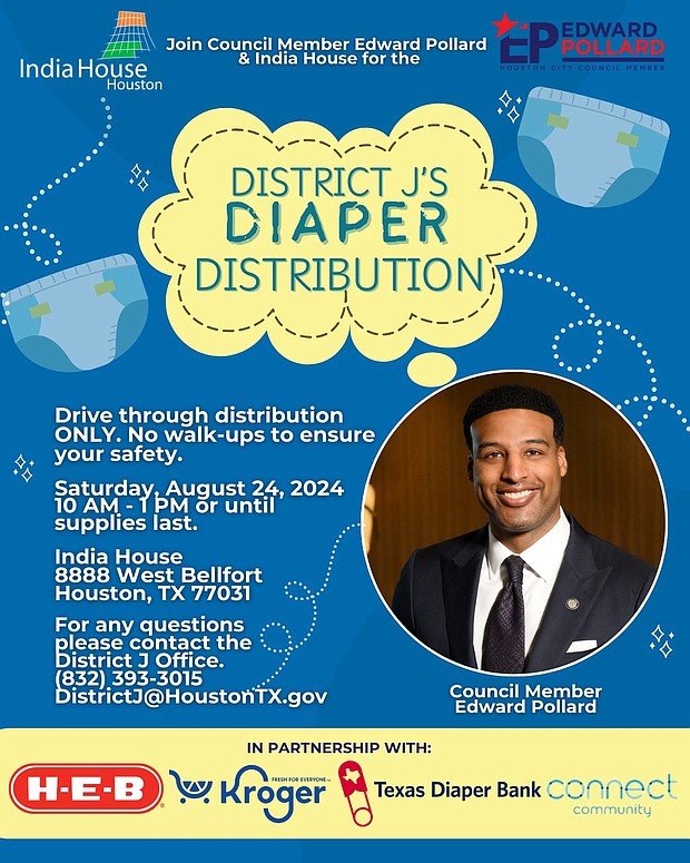 Council Member Edward Pollard is hosting a Diaper Distribution event in collaboration with community partners to support financially burdened families in Houston's diverse District J.