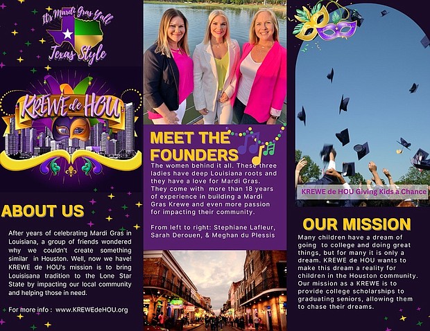 The inaugural KREWE de HOU Mardi Gras Ball, presented by KREWE de HOU Foundation is scheduled for Saturday, February 3 at the JW Marriott by the Galleria in Houston. This first ever Mardi Gras ball will boast entertainment, a Mardi Gras program, the presentation of the 2024 Mardi Gras court, crowning of the 2024 King and Queen and scholarship presentations. Attendees will dance the night away with DJ Supa Dave, from Lafayette, Louisiana while also enjoying hors d’oeuvres and an open bar.