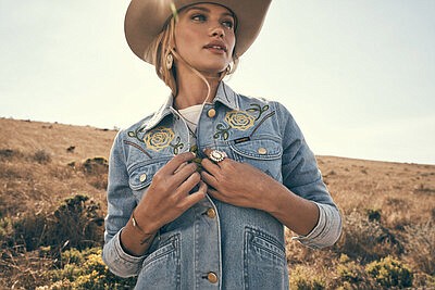 Yellow Rose by Kendra Scott announces the launch of its first-ever collaboration, a joint collection with global denim brand Wrangler®. The limited-edition Wrangler x Yellow Rose by Kendra Scott collection features signature Kendra Scott silhouettes and inlaid gemstones, woven together with modern, elevated fits and finishes from the most authentic denim brand of the West. This product line presents both jewelry and apparel, a first for the Yellow Rose by Kendra Scott brand, and celebrates ranch culture, the natural environment of the Southwest and the spirit of its hard-working people.