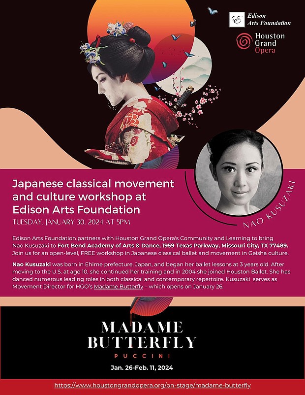 The Edison Arts Foundation, a beacon of fine arts and cultural enrichment in Fort Bend, proudly partners with the Houston Grand Opera (HGO) to present a unique cultural workshop featuring the illustrious Nao Kusuzaki. This event underlines the foundation's commitment to arts education and community engagement, offering local students a dive into the profound depths of Japanese culture.