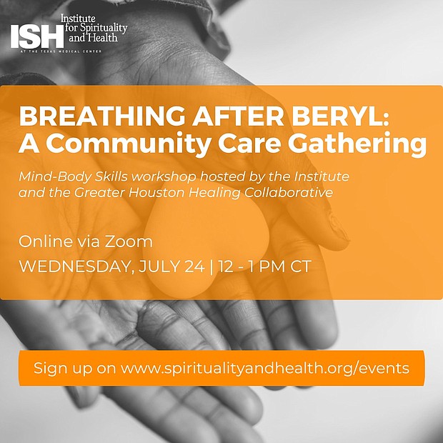 In the aftermath of Hurricane Beryl, the Institute for Spirituality and Health, along with its Greater Houston Healing Collaborative (GHHC) partners, is stepping up to support the community with a FREE virtual event titled "Breathing After Beryl: A Community Care Gathering" on Wednesday, July 24, 2024.