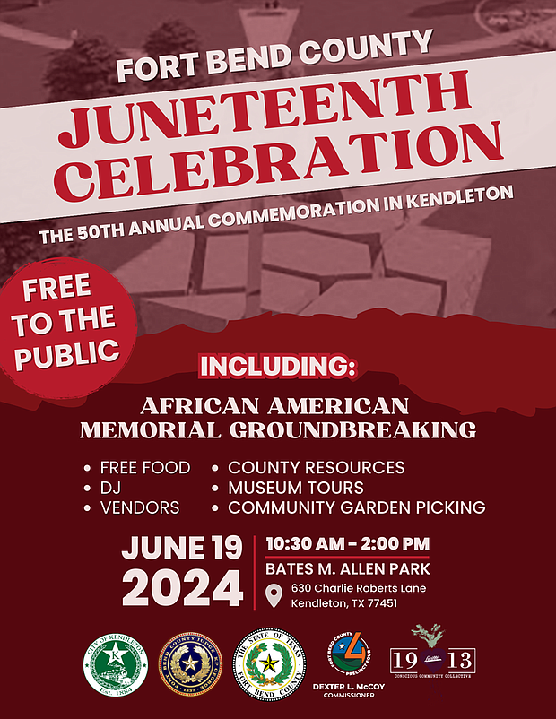 The City of Kendleton, in collaboration with Fort Bend County Judge KP George, Precinct 4 Commissioner Dexter McCoy, and Lucille's 1913, is excited to commemorate the 50th Annual Juneteenth Celebration. This historic event will take place on Wednesday, June 19, from 10:30 a.m. to 2:00 p.m. at Bates Allen Park, 630 Charlie Roberts Lane, Kendleton, TX 77451. This celebration is free and open to the public, inviting everyone to join in honoring this significant milestone.