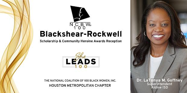 The Houston Metropolitan Chapter of the National Coalition of 100 Black Women, Inc. (NCBW® 100) is honoring Aldine ISD Superintendent Dr. LaTonya M. Goffney at its 3rd Annual Blackshear-Rockwell Scholarship & Community Heroine Awards Reception for her outstanding contributions to education.
