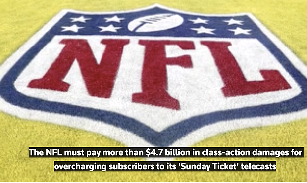 A jury ordered the NFL on Thursday to pay more than $4.7 billion for anti-trust violations surrounding its “Sunday Ticket” package, which lets fans watch games outside of their home markets but required them to buy access to a bundle of games to do so.