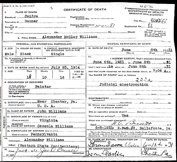 In 1931, 16-year-old Alexander McClay Williams became the youngest person executed in Pennsylvania's history. Convicted of murdering Vida Robare, a matron at the Glen Mills School, a youth detention facility near Philadelphia, his execution by electric chair left his family in anguish and shame. For 85 years, his sister, Susie Williams Carter, believed he was guilty. However, new evidence has surfaced, prompting Carter and her family to seek justice for Alexander and clear his name.