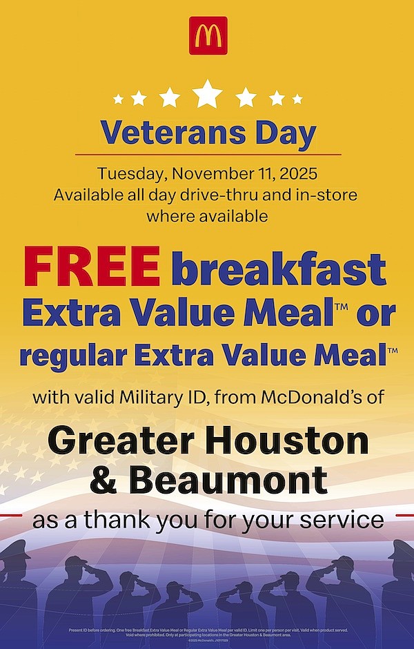 This Veterans Day, McDonald’s is honoring Houston’s military servicemen and women with free breakfast and Extra Value Meals. See how you can celebrate and enjoy a complimentary meal on Tuesday, Nov. 11, 2025.