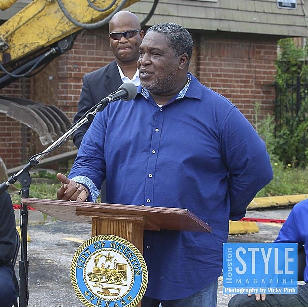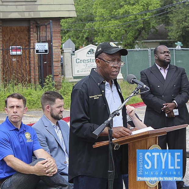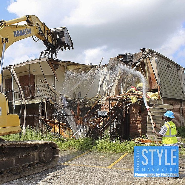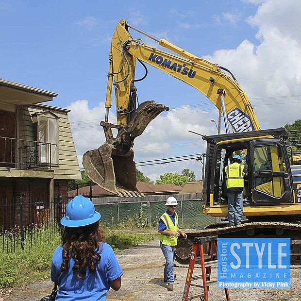 Photography by Vicky Pink - Mayor Sylvester Turner joined the City of Houston Housing and Community Development Department in the demolition of Crestmont Village Apartments. The community was previously plagued by dangerous living conditions, squatters and illegal activity from the blighted complex. Through the coordinated efforts of nine city departments, over 300 residents were relocated and the city obtained a court order to shut down and demolish the property. Special remarks were given by Congressman Al Green and Council Member Dwight Boykins.