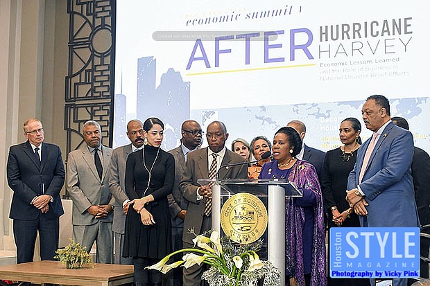 Photography by Vicky Pink - Congresswoman Sheila Jackson Lee hosted the Congressional Black Caucus Foundation (CBCF) 5th Executive Economic Summit. The distinguished delegation discussed relevant economic issues, especially during this current post-Hurricane Harvey period. Themed “After Hurricane Harvey: Economic Lessons Learned and the Role of Business in National Disaster Relief Efforts,” the Summit focused on mapping minority access to capital with business leaders and others in the financial services sector in addition to those our communities impacted by Hurricane Harvey. The Houston Summit featured a special issue town hall forum on the role of business and other relevant organizations in assisting African American communities with disaster relief. Some in attendance were Mayor Sylvester Turner, Rev. Jesse L. Jackson, Texas State Representative Senfronia Thompson, John Mingé, Robert F. Smith, Donna M. Sims Wilson, Colette D. Honorable, Courtney Johnson Rose, Carlecia D. Wright, Gerald Womack, Carla Lane, Linda Lorelle and Julia Hogan-McNeil.