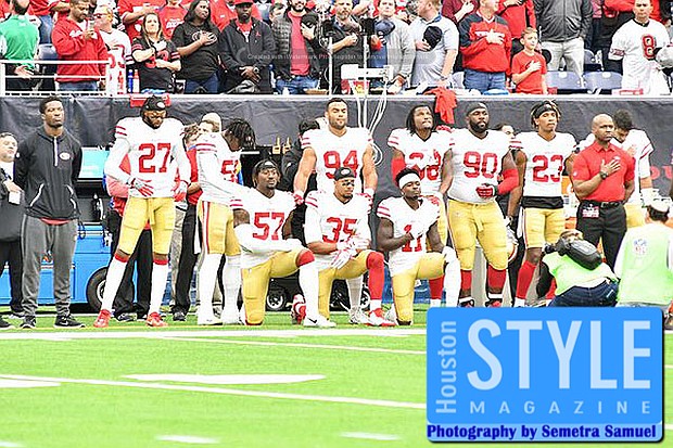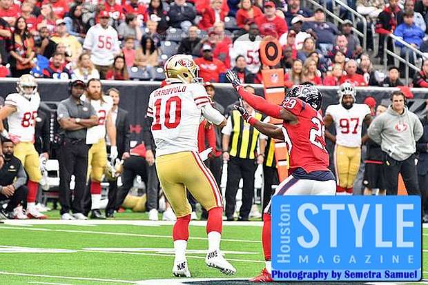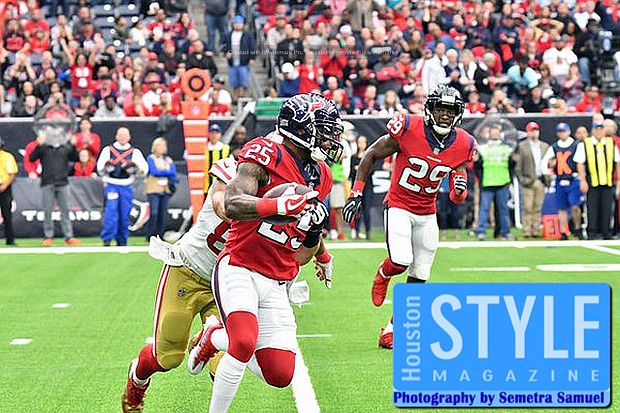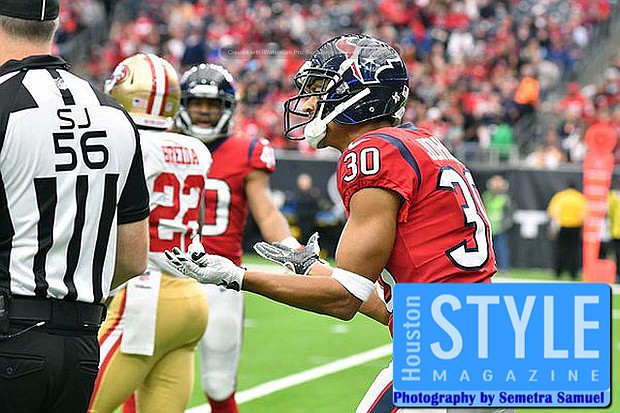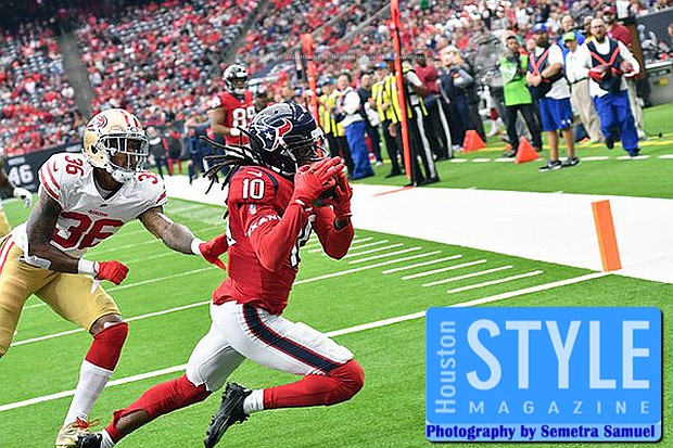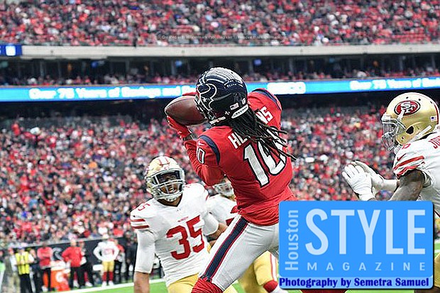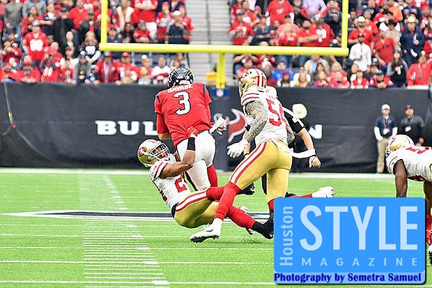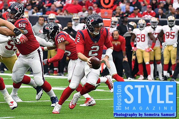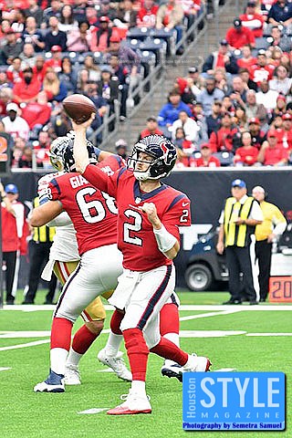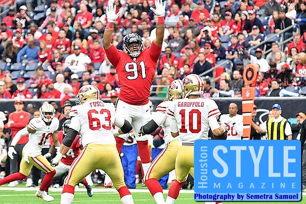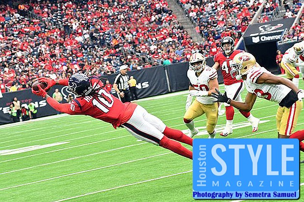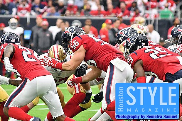 Photography by Semetra Samuel - It was Battle Red Sunday for the Houston Texans. This week they faced the San Francisco 49ers. Although they battled hard, the Texans would come up short with a heartbreaking 26-16 loss. Sunday’s game featured a number of exciting moments. Simone Biles, 19-time combined Olympic and World Champion medalist, served as an honorary Houston Texans Cheerleader and joined the Cheerleaders on the sideline during the first half. Another Houston star, Houston Rockets legend Hakeem Olajuwon, served as the Homefield Advantage Captain. Several dedicated Texans fans were recognized through the “Celebration of Tailgating.” The game also featured the 16th edition of the H-E-B “Tailgater of the Year” competition held in the RTIC Tailgate lane. The inaugural “Commissioner’s Cup” was held in the NRG Stadium parking lots. Judged by Houston Texans President Jamey Rootes and the “Commissioner of Tailgating” Joe Cahn.