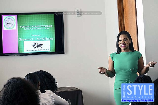 Photography by Vicky Pink - Shawntell L. McWilliams facilitated a Social Graces and Dining Etiquette Seminar for the Alpha Kappa Alpha Sorority, Incorporated - Sigma Rho Omega Chapter Debutantes. Miss Houston Hannah Johannes also made a special appearance to give words of wisdom to the debs. Besides the seminar, the young ladies also went on an HBCU College Tour at Texas Southern University and Prairie View A&M University and had a day of shopping at the Galleria. Some in attendance were Alice Cooper, Lisa Trenell Nellie Tomkies, and Gloria Tankey Herring-Washington.