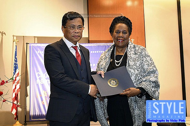 Photography by Vicky Pink - The Consul General of Vietnam and Spouse held a reception in honor of the Vietnamese Lunar New Year. During the reception, guests enjoyed an art painting exhibition and a Vietnamese long dress show (Women’s Ao dai). Congresswoman Sheila Jackson Lee was on hand for a formal Congressional presentation. Under the direction of Consul General of the Socialist Republic of Vietnam Nguyen Van Hoa, the Consulate General of Vietnam in Houston continues to bridge friendships and relationships with the US and Vietnam. This relationship has expanded the US consular district from Ho Chi Minh city to 22 provinces in the southern part of Vietnam. The Vietnamese Lunar New Year is the most important celebration in Vietnamese culture. It celebrates the arrival of spring and is based on the Vietnamese calendar.