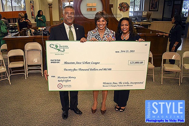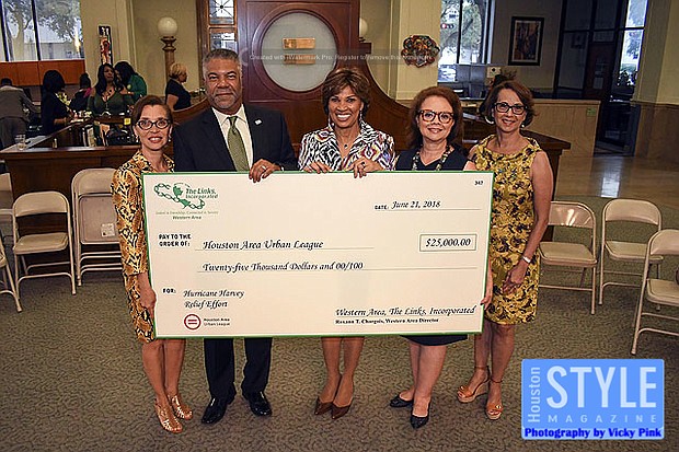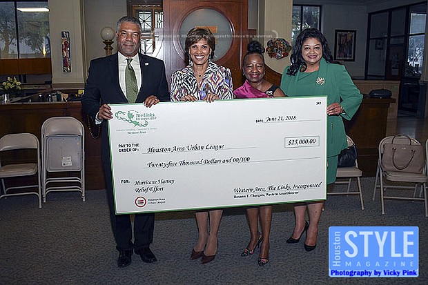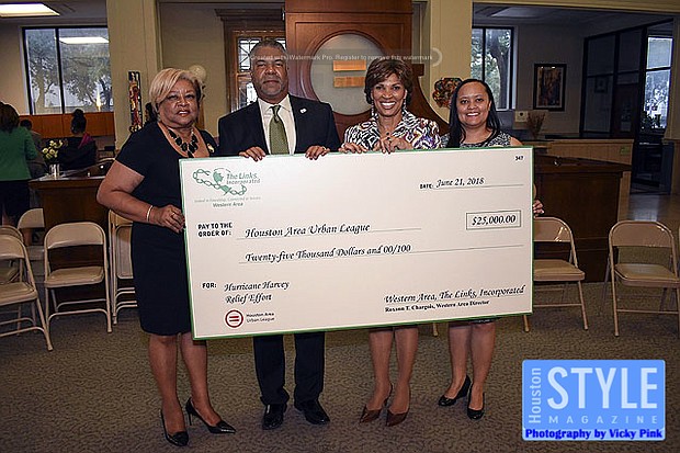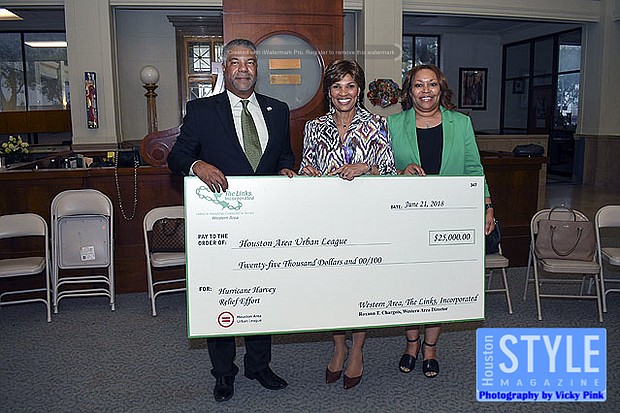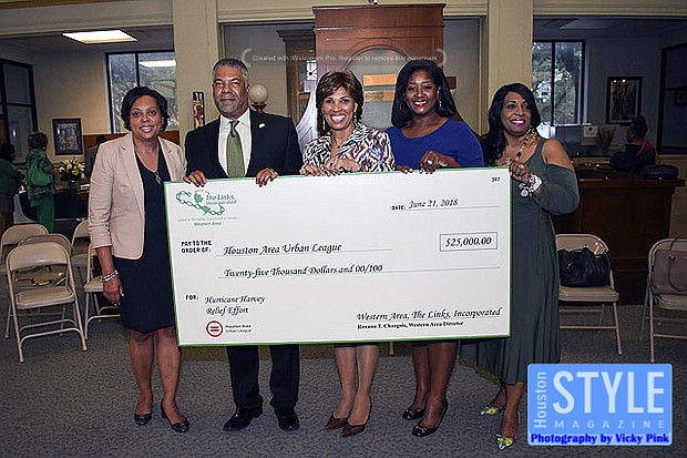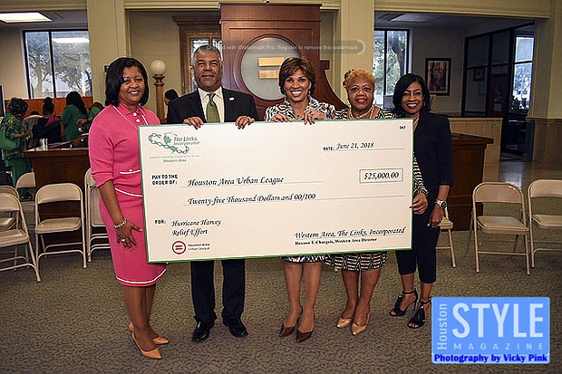 Photography by Vicky Pink - So many Houstonians are still suffering from the effects of Hurricane Harvey. The Western Area of The Links Inc. are doing their part to help their neighbors with a $25,000 donation to the Houston Area Urban League. WA Director, Roxanne Chargois along with the Houston Cluster Presidents Recognized Houston Area Urban League President, Judson Robinson. Some in attendance were LaDonna Harris, Patricia Ingram, Carlotta Brown, Vera Bumpers, Cora Robinson, Carolyn Guess, Lorna Hankins, and Carla R Penn-Hopson.
