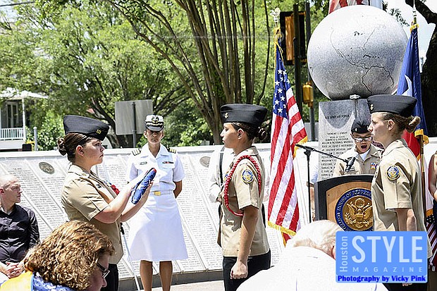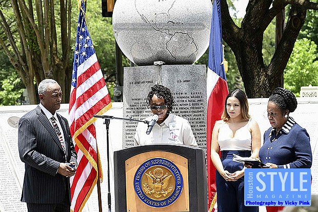 Photography by Vicky Pink - On Memorial Day Congresswoman Sheila Jackson Lee recalled the sacrifice of those who have given their last full measure of devotion defending our country and standing for the cause of freedom. During the program, she honored the late Leonard Luther Ball, who was instrumental in the construction of this memorial. This year’s commemoration of Memorial Day was also the 70th Anniversary of the Women’s Armed Services Integration Act. Women Veterans Judy Cushman Dubose, Camella Andrews, Keli Chevalier, Mathilda Montgomery and Mallory Valle were honored. An honoree of The Mission Continues, Nestor Mavis, will also be present, as was Olivia Christina Bush, an honoree of It’s My Time to Serve. CDR Rosalind Brooks, USN (ret.) was the guest speaker.