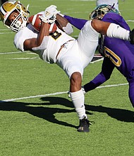 PV defensive lineman Jason Dumas celebrates second-half sack Published on November 6, 2021 |