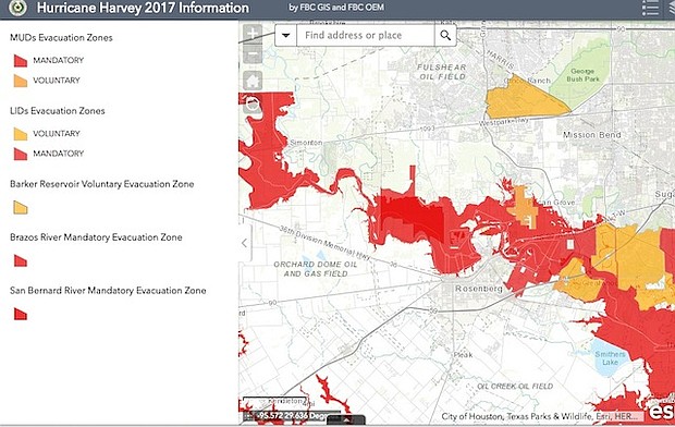 UPDATE 8/28 5 p.m.: The interactive maps of evacuation zones for the Brazos and San Bernard Rivers now contain evacuation routes. Residents can search their address to see if they are part of an evacuation order:
