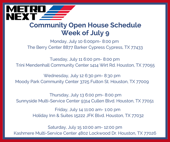 METRO's summer listening tour ramps up next week. The public is invited to share ideas for transit service now and into the future. METRO is developing a regional transit plan that will serve the Greater Houston area through 2040. Next week's schedule is listed below. The tour continues through mid-August.