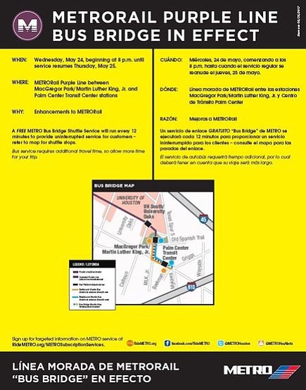 METRO will make improvements to the overhead power system along the Purple Light Rail Line tomorrow which will impact evening travel. The scheduled work is necessary to ensure METRO continues to provide reliable light-rail service to customers.