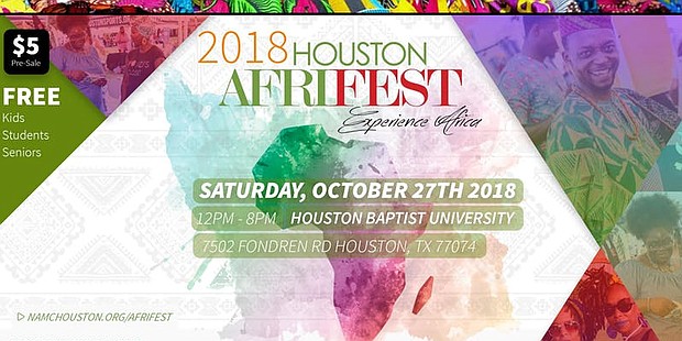 Houston, the most diverse city in the U.S. will again take center stage as it pays tribute to the continent of Africa. On Saturday, October 27th, 2018 the Nigerian American Multicultural Council (NAMC) and the African Student Association – Houston Baptist University host its 6th annual Houston AfriFEST - a festival of African arts, culture, and entertainment from Noon to 8:00 p.m. on the grounds of the Houston Baptist University, located at 7502 Fondren Rd., Houston, TX 77074.