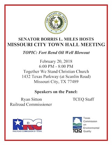 In December 2017, an oil well blew out in Fort Bend County and emitted a foul odor that permeated throughout local neighborhoods. Senator Miles is hosting a Town Hall to discuss the oil well blowout and has personally invited Railroad Commissioner Ryan Sitton and TCEQ staff to provide the community an update, explain the health impacts, the status of the clean-up and discuss how we move forward to reduce the chances of this event from ever occurring again.