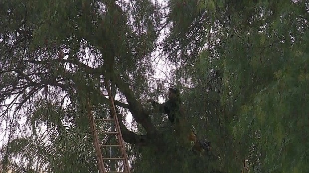 A woman who had climbed up a tree in Canoga Park and refused to come down for nearly 12 hours was finally coaxed down by firefighters Tuesday morning, officials said.