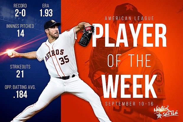 Major League Baseball announced this afternoon that Houston Astros right-handed pitcher Justin Verlander has been named the American League Player of the Week for the week of Sept. 10-16. This marks the eighth career American League Player of the Week award for Verlander and his second this season. The other came the week of April 9-15.