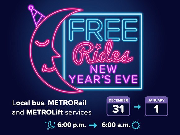 Have fun and ride safely on New Year's Eve – courtesy of METRO. Free rides will begin at 6 p.m. New Year's Eve (Dec. 31) until 6 a.m. New Year's Day (Jan. 1) on local bus, METRORail and METROLift. Have fun and ride safely on New Year's Eve – courtesy of METRO. Free rides will begin at 6 p.m. New Year's Eve (Dec. 31) until 6 a.m. New Year's Day (Jan. 1) on local bus, METRORail and METROLift.