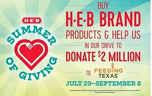 In the spirit of Texans helping Texans, H-E-B has launched the Summer of Giving, a new charitable initiative that, with the help of customers, looks to raise up to $2 million to benefit Feeding Texas and its network of food banks across the state. The fundraising effort, which would equal 20 million meals, is another way the San Antonio-based retailer is continuing its ongoing charge as a partner in the fight against hunger.