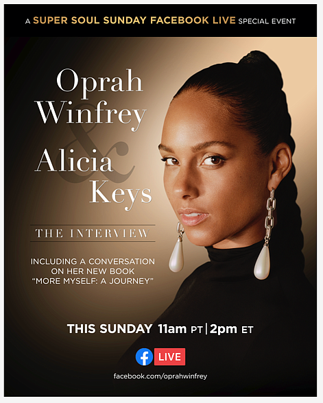 Intimate One-on-One Conversation with Oprah and 15-Time Grammy Winning Artist Alicia Keys About Her New Book More Myself: A Journey, Life, Career, and How She and Her Family are Staying “Safer at HomeOprah Winfrey Network announces a special Facebook Live event featuring Oprah Winfrey in an intimate one-on-one conversation with 15-time Grammy winning artist, songwriter, producer, and New York Times best-selling author Alicia Keys about her life and career, as well as how Keys and her family are staying “Safer at Home.”